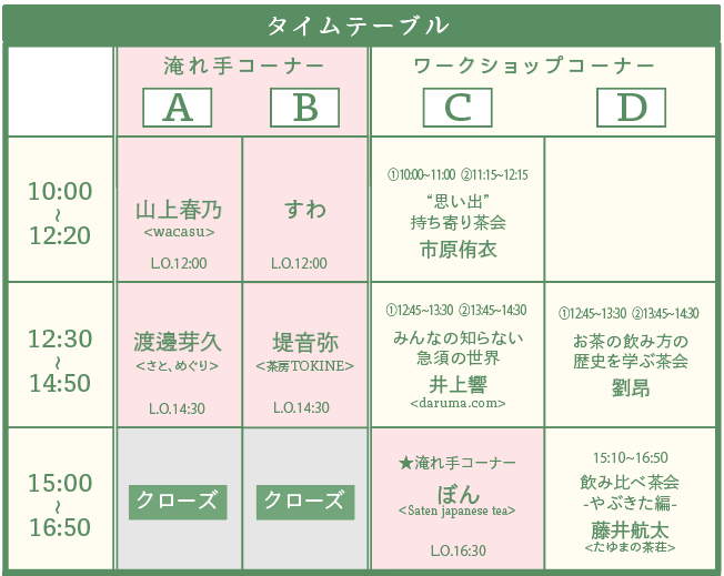 淹れ手たちは、どんなお茶を選び、どう淹れるのか。彼らの姿を目で楽しみ、想いに耳を傾け、それぞれのお茶を味わってみてください。