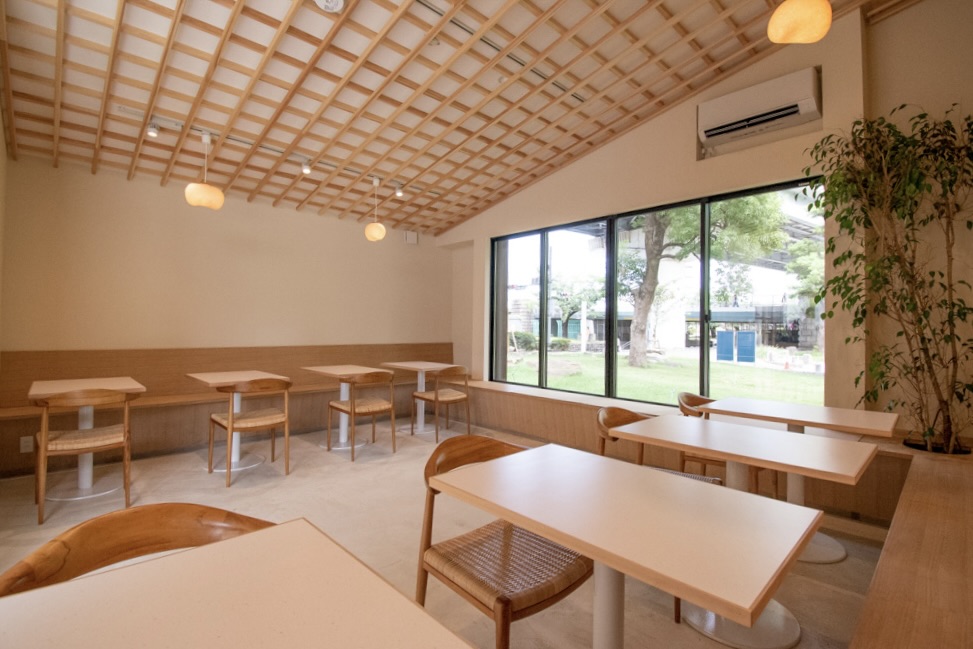 和の趣を取り入れた店内には格子天井や杉の一枚板カウンターがあしらわれ、木の温もりに満ちています。大きな窓からは公園の緑が広がり、穏やかな時間を過ごすのに最適です。