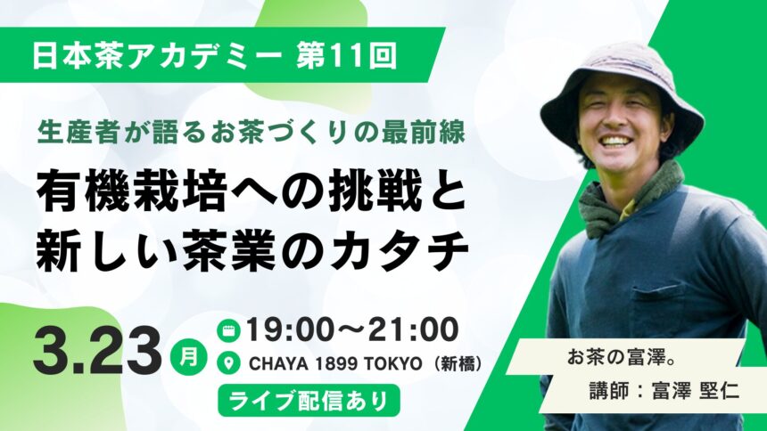 「日本茶アカデミー 第11回」が3/23(月)に開催。『お茶づくりの最前線〜有機栽培への挑戦と新しい茶業のカタチ〜』 講師:富澤 堅仁(お茶の富澤。)