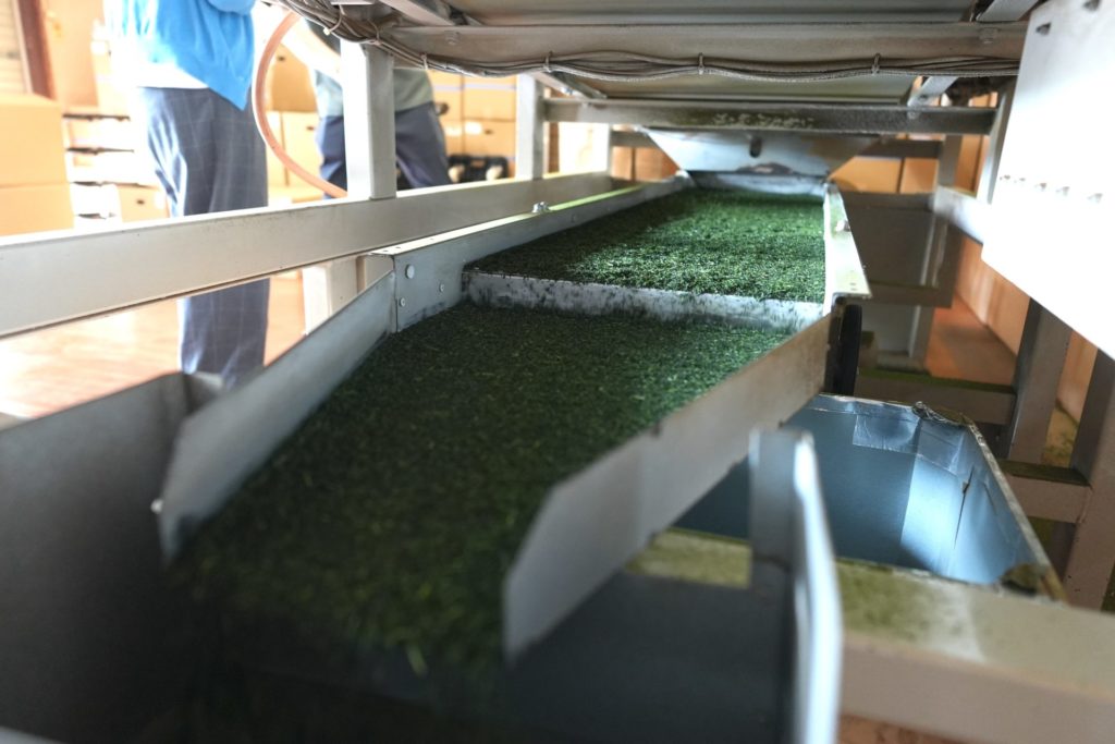 二瀬さん「仕入れた荒茶はまだ水分が多く、葉以外にも茎や粉が混じっている状態なので、まずはじめに使用する葉とそれ以外を選別して整えます。そして”火入れ”は、お茶の味を決める最も重要な工程で、温度や時間を繊細に調整します。最後に特徴の異なる茶葉を組み合わせるブレンド作業”合組”で味わいに奥行きを出して、商品となるお茶が完成します」